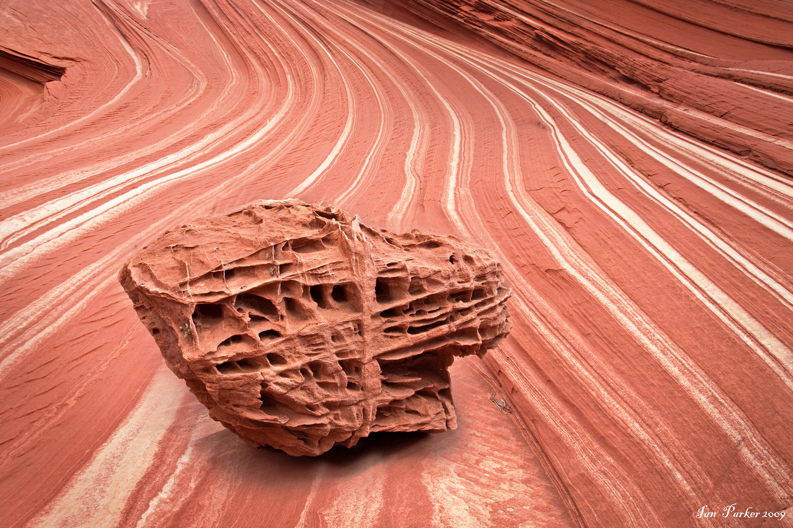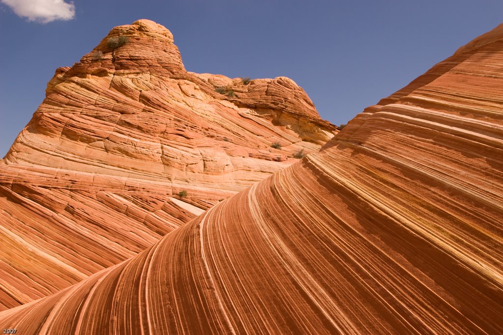 The Wave is a sandstone rock formation located in the United States of America near the Arizona-Utah border, on the slopes of the Coyote Buttes, in the Paria Canyon-Vermilion Cliffs Wilderness, on the Colorado Plateau. It is famous among hikers and photographers for its colorful, undulating forms, and the rugged, trackless hike required to reach it.